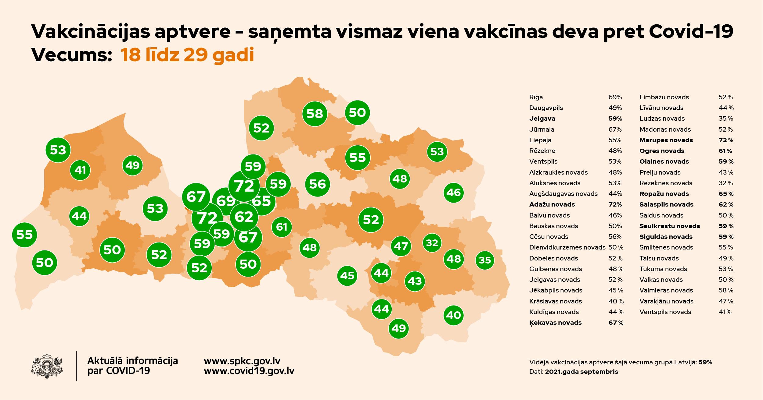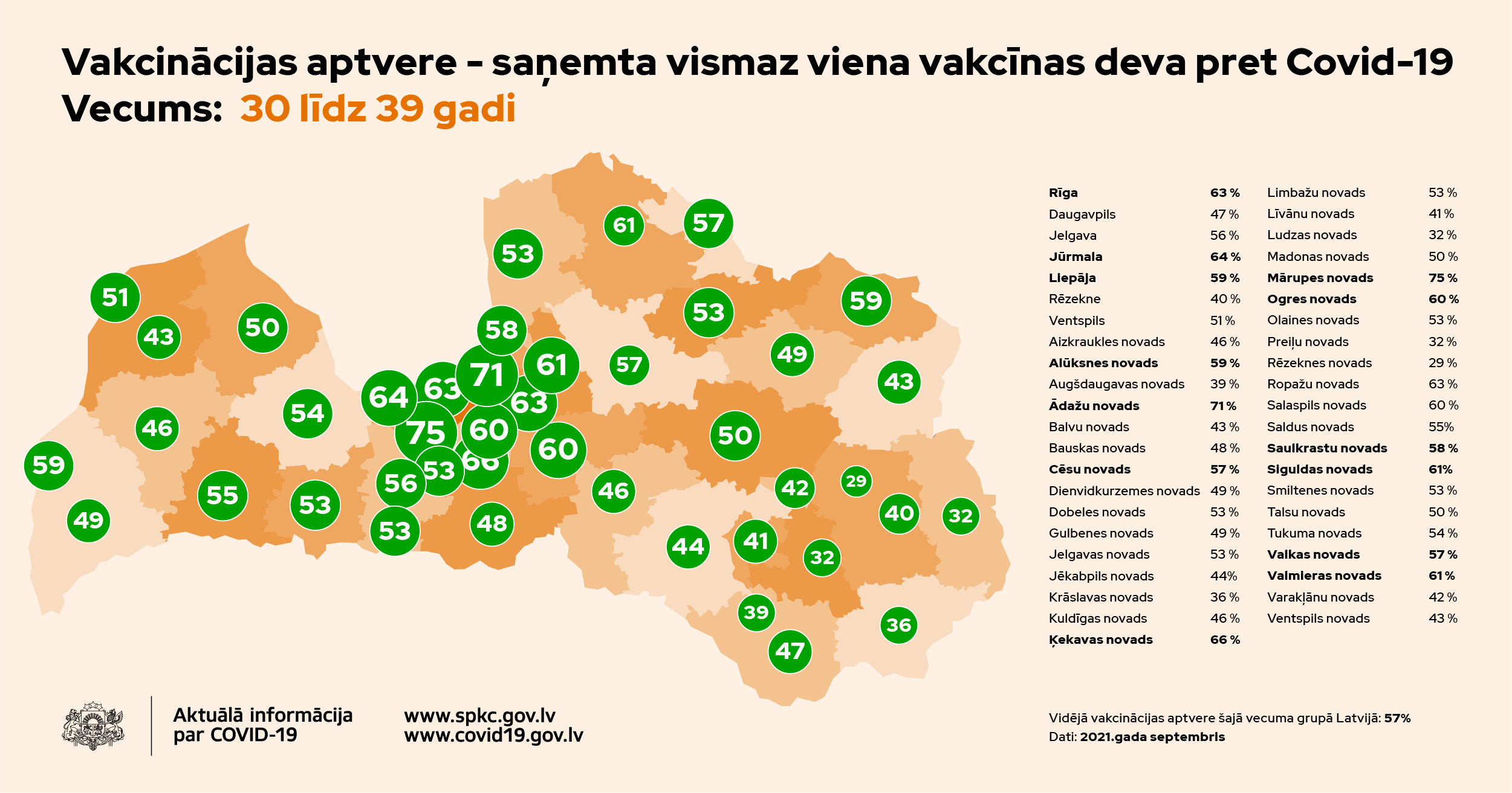 Kopumā vecuma grupā no 30 līdz 59 gadiem visvairāk vakcīnas pret Covid-19 saņēmuši Mārupes, Ādažu, Ķekavas, Valmieras novada un Rīgas iedzīvotāju. Piemēram, vecumā no 30 līdz 39 gadiem Mārupes novadā vismaz vienu vakcīnas devu pret Covid-19 saņēmuši jau 75 % iedzīvotāju, kamēr vidēji valstī – vairāk nekā puse jeb 57%.