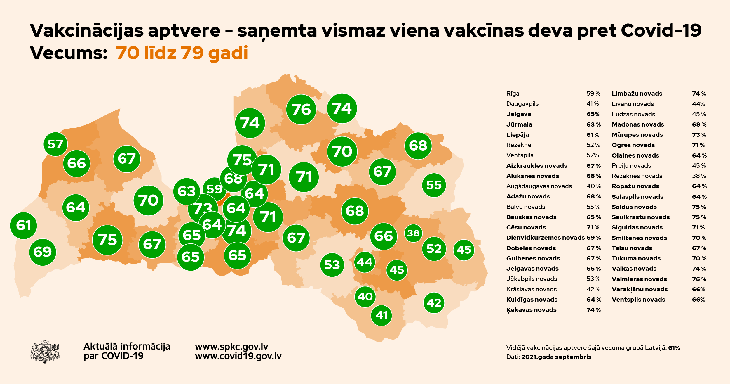 Kopumā visvairāk senioru (vismaz ar vienu devu) vakcinēti Valmieras, Saldus, Limbažu, Cēsu un Mārupes novadā. Šajos novados vairāk nekā 70% senioru ir saņēmuši vismaz vienu pret Covid-19 vakcīnas devu (vecuma grupās no 60 līdz 69, kā arī no 70 līdz 79 gadiem). Tāpat šajos novados ir augstākie vakcinācijas rādītāji vecuma grupā no 80 līdz 89 gadiem (vismaz vienu poti saņēmuši vairāk nekā 60 % senioru). Vecuma grupā virs 90 gadiem visaktīvāk vakcīnu pret Covid-19 ir saņēmuši Valmieras novada iedzīvotāji – 48%.