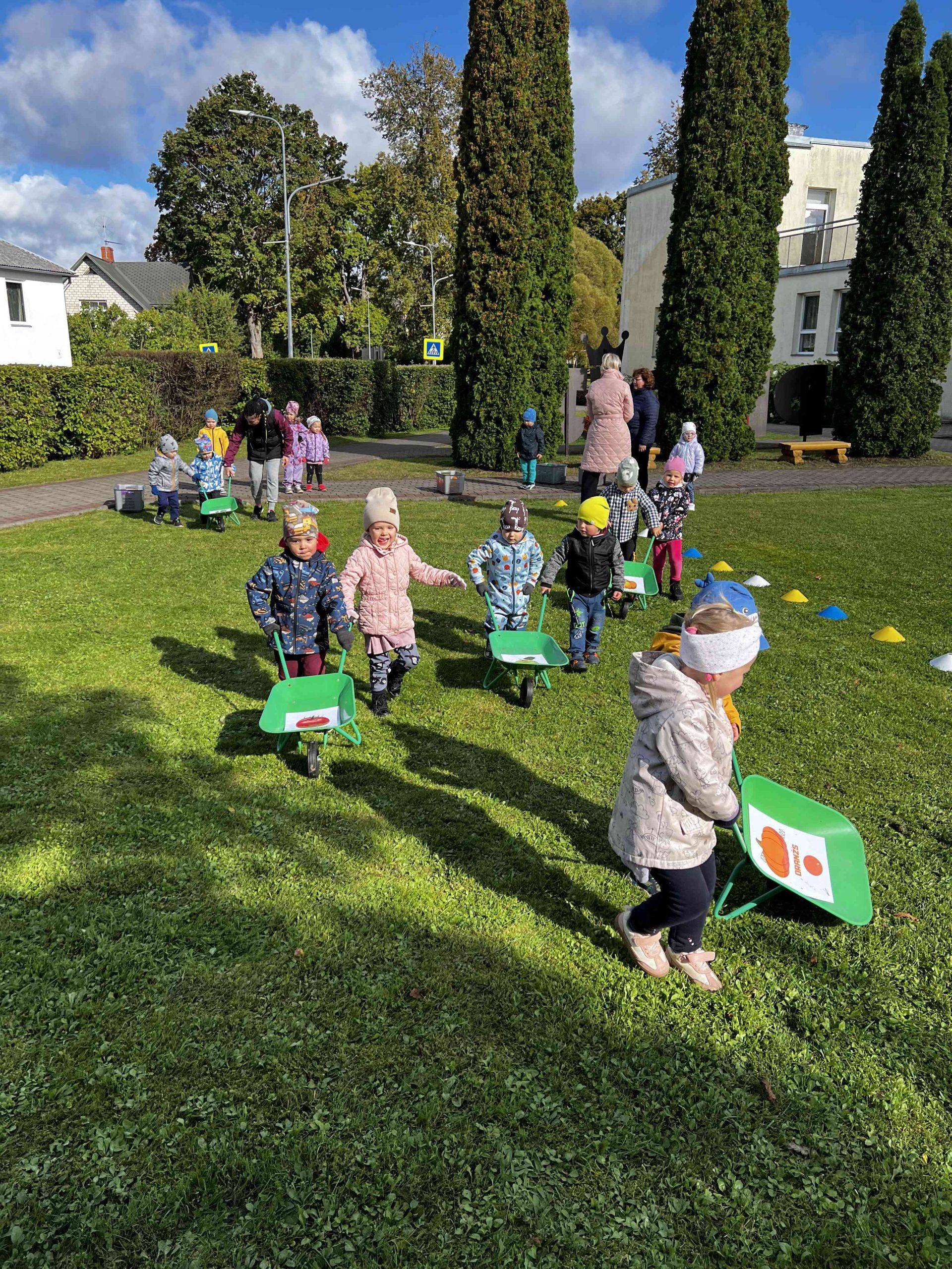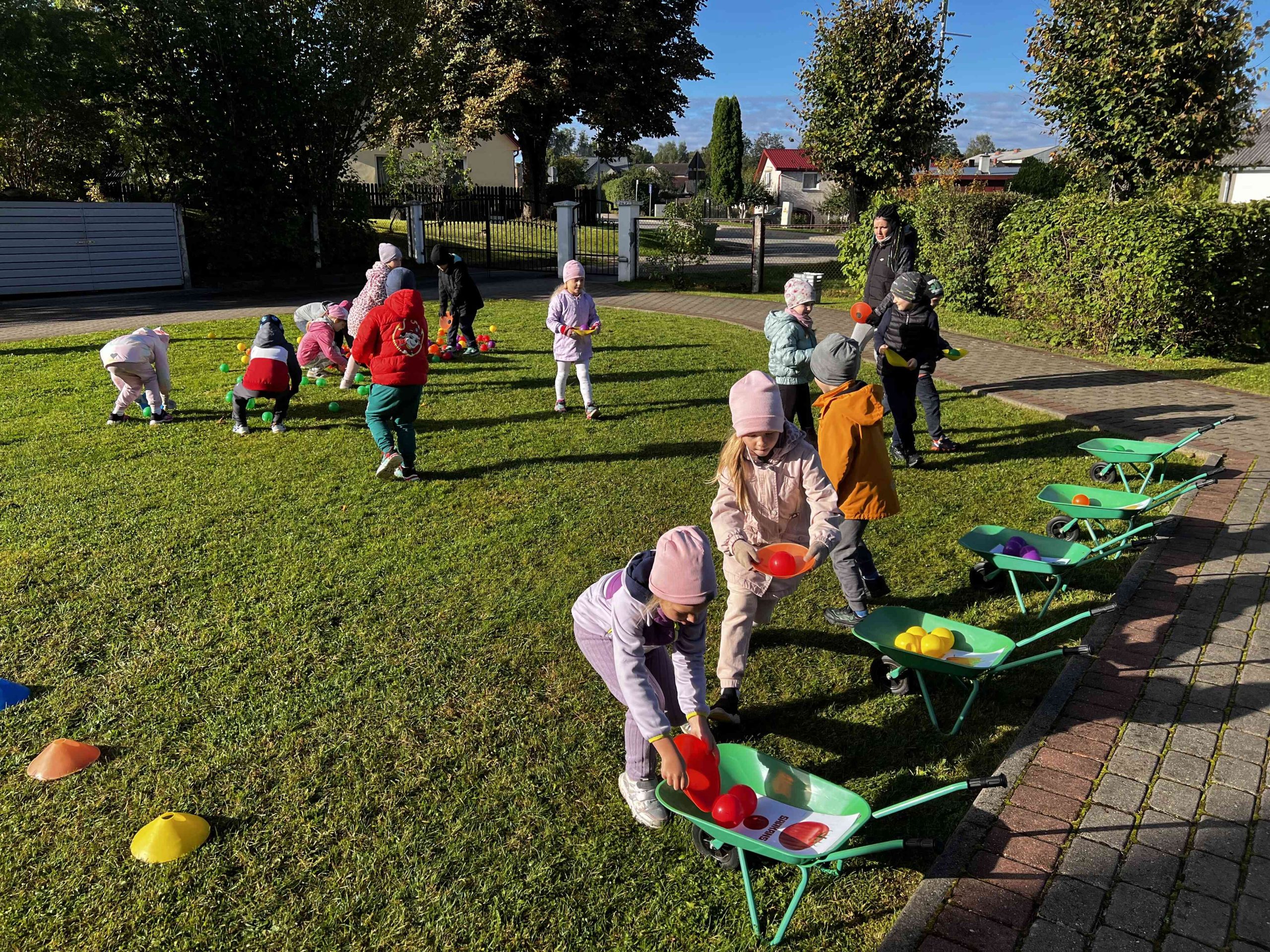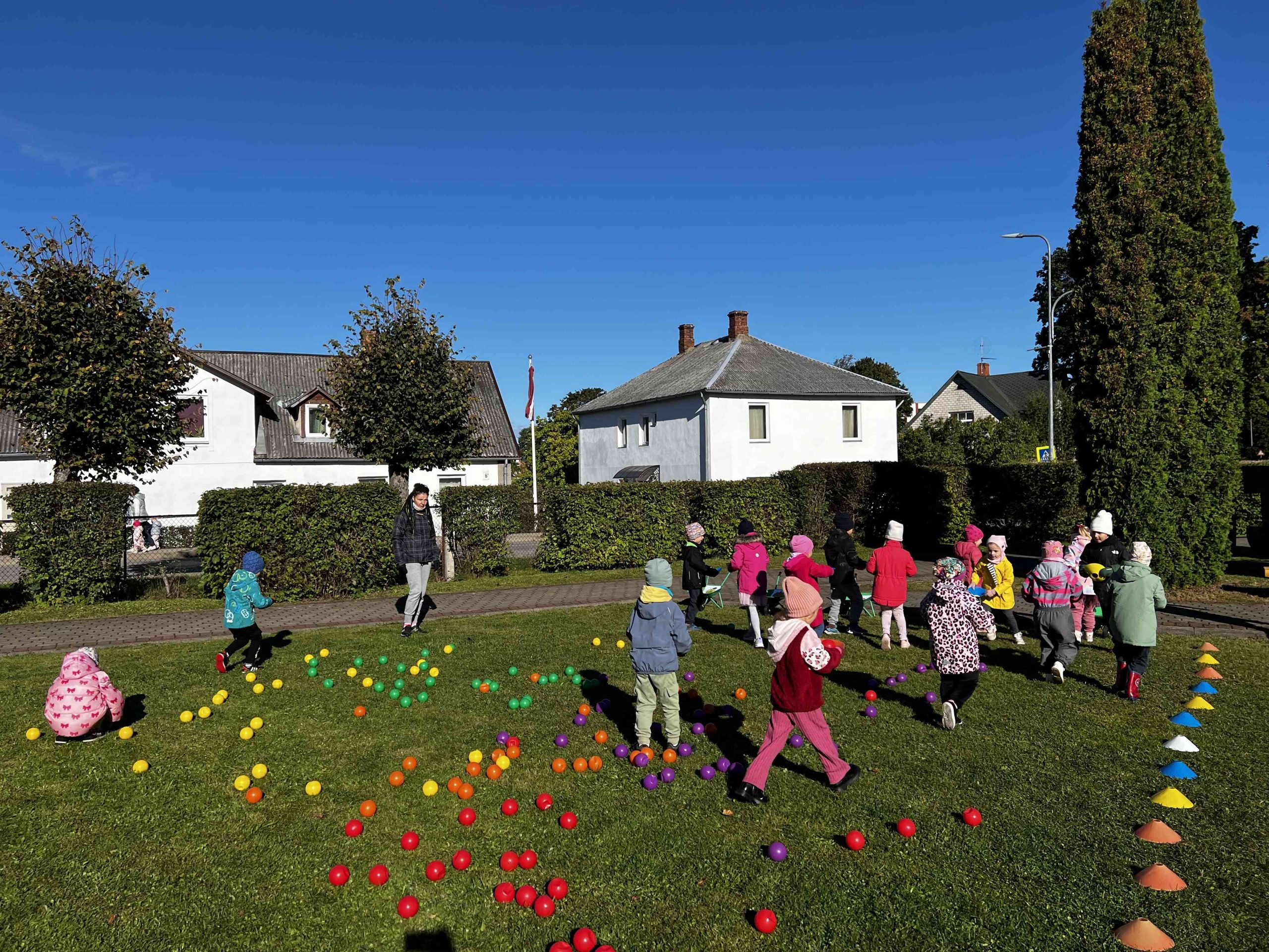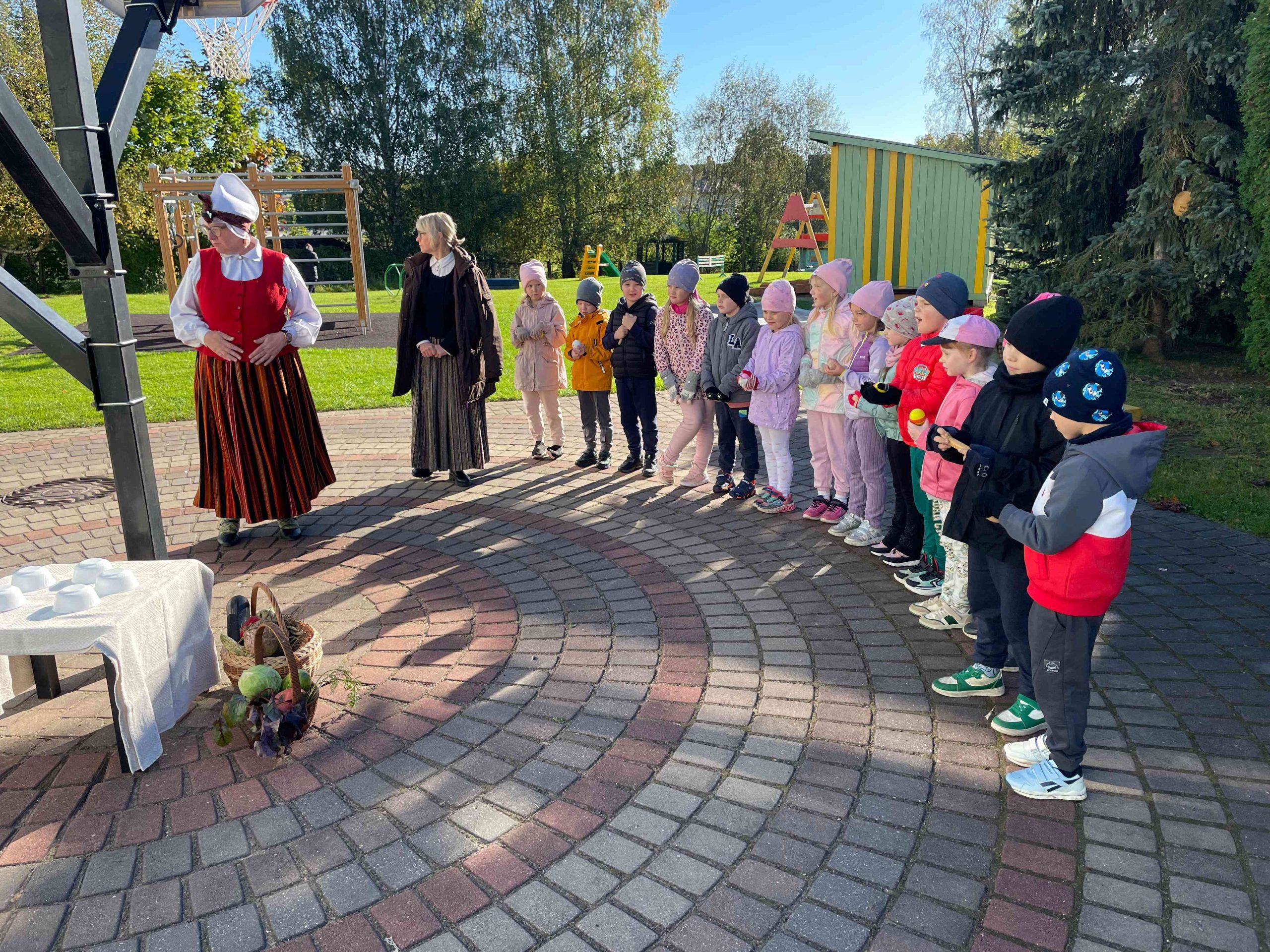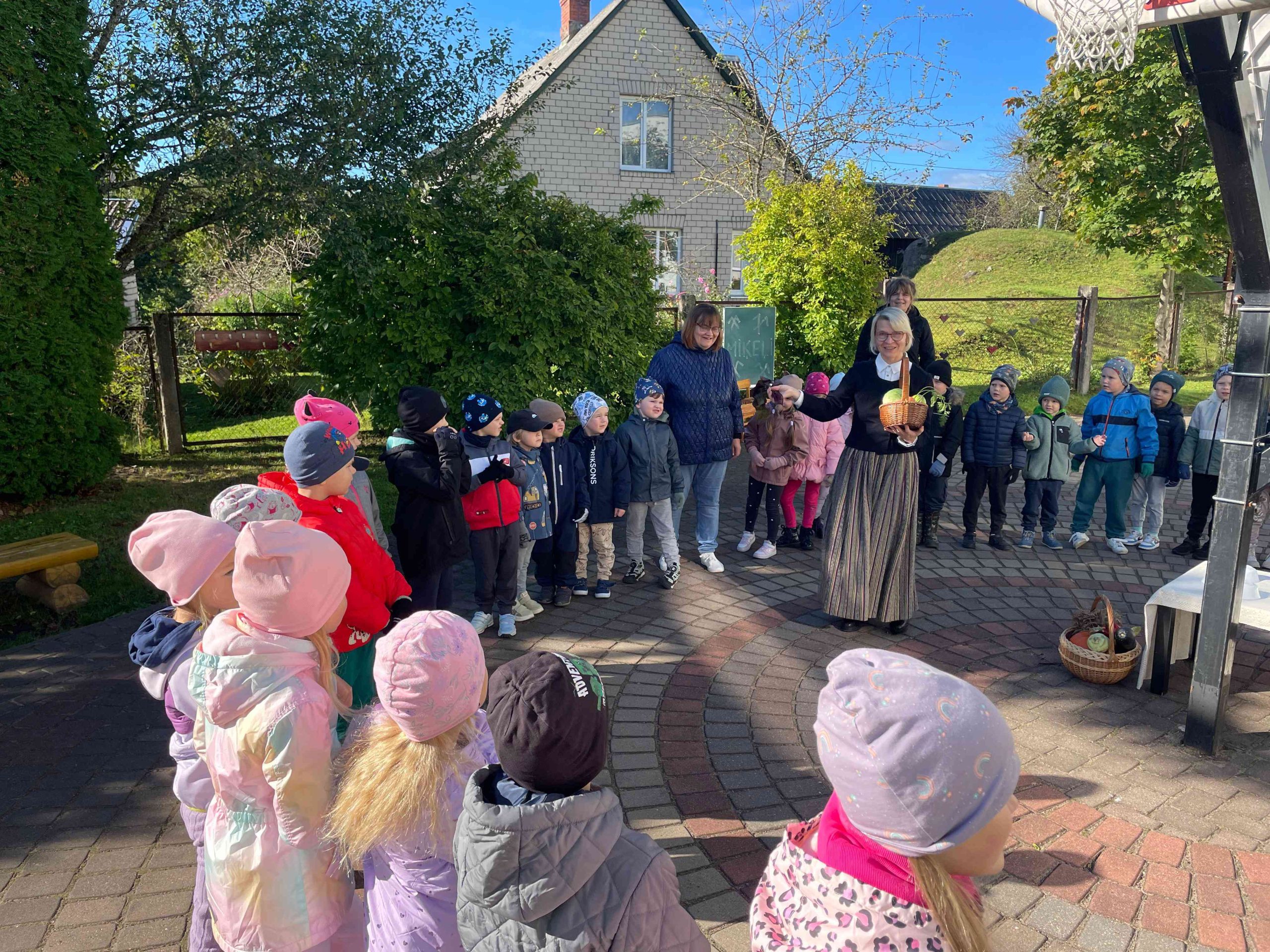 Saulainā 25.septembra rītā priecīgi bērni un skolotājas pulcējās kopā iestādes āra teritorijā un akordeona mūzikas pavadījumā ieskandināja rudens gadskārtu svētkus – Miķeļus.