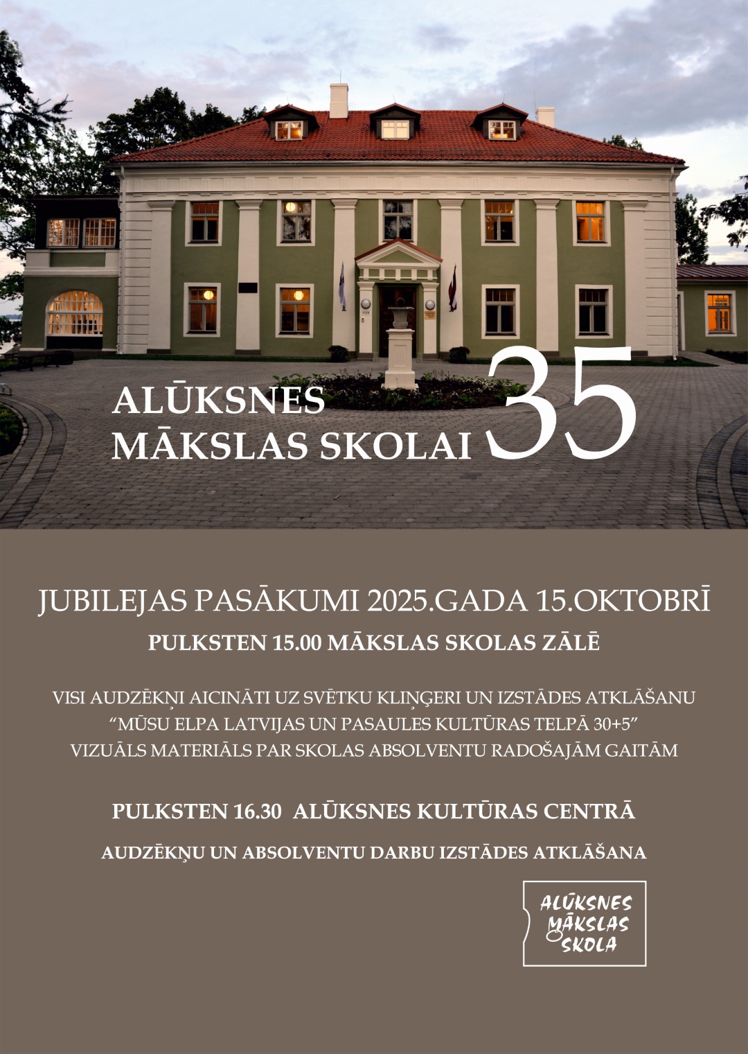 15. oktobrī pulksten 15.00 Alūksnes Mākslas skolas zālē visi audzēkņi aicināti uz svētku kliņģeri un izstādes atklāšanu “Mūsu elpa Latvijas un pasaules kultūras telpā 30+5” – vizuāls materiāls par skolas absolventu radošajām gaitām.