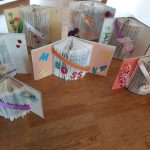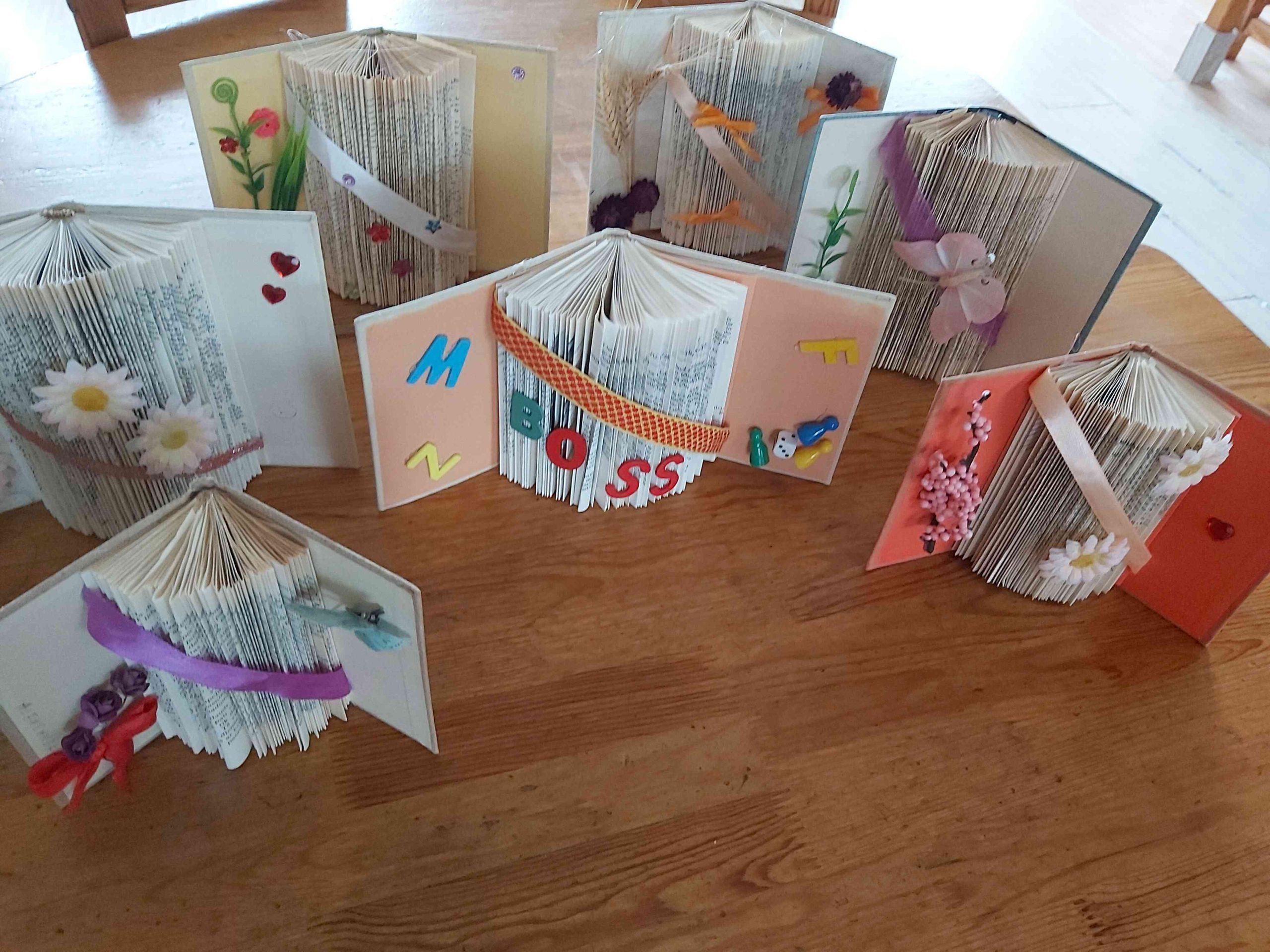 Radošajos darbos izmantojām otrreiz izmantojamos materiālus – kartona rullīšus, kafijas aparāta filtrus, devām “otru dzīvi” vecajām grāmatām. Locījām grāmatām lapas un papildinājām ar dekorācijām.