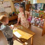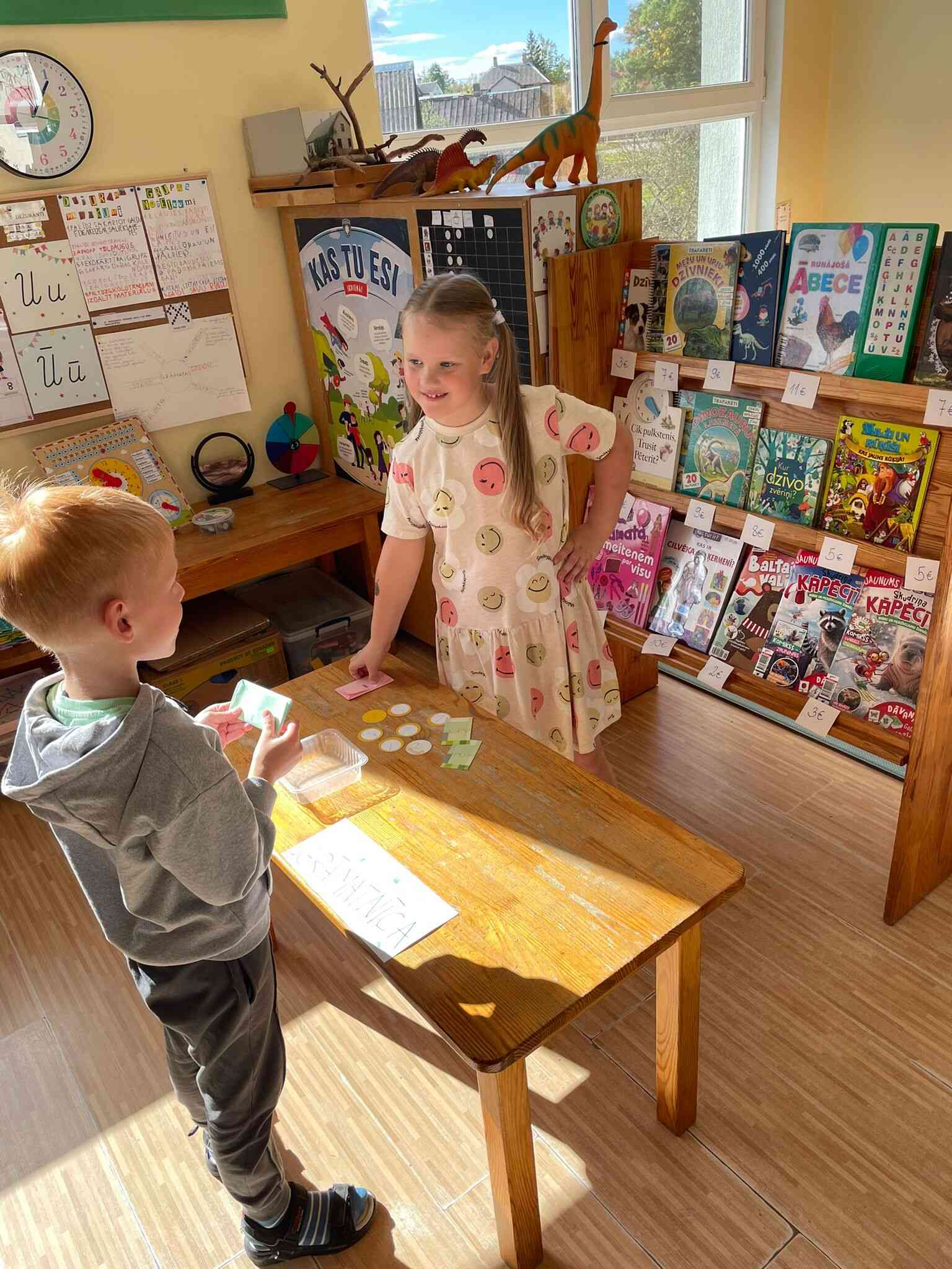 Bērni praktiski darbojās pašu izveidotajā grāmatu veikalā – grāmatnīcā, veidojām izpratni par vērtību (cena, atlikums). Bērni vispirms izgatavoja maciņu, tad naudu. Iepirkās grāmatnīcā, skaitīja naudu, lai nopirktu grāmatu pēc savas izvēles.