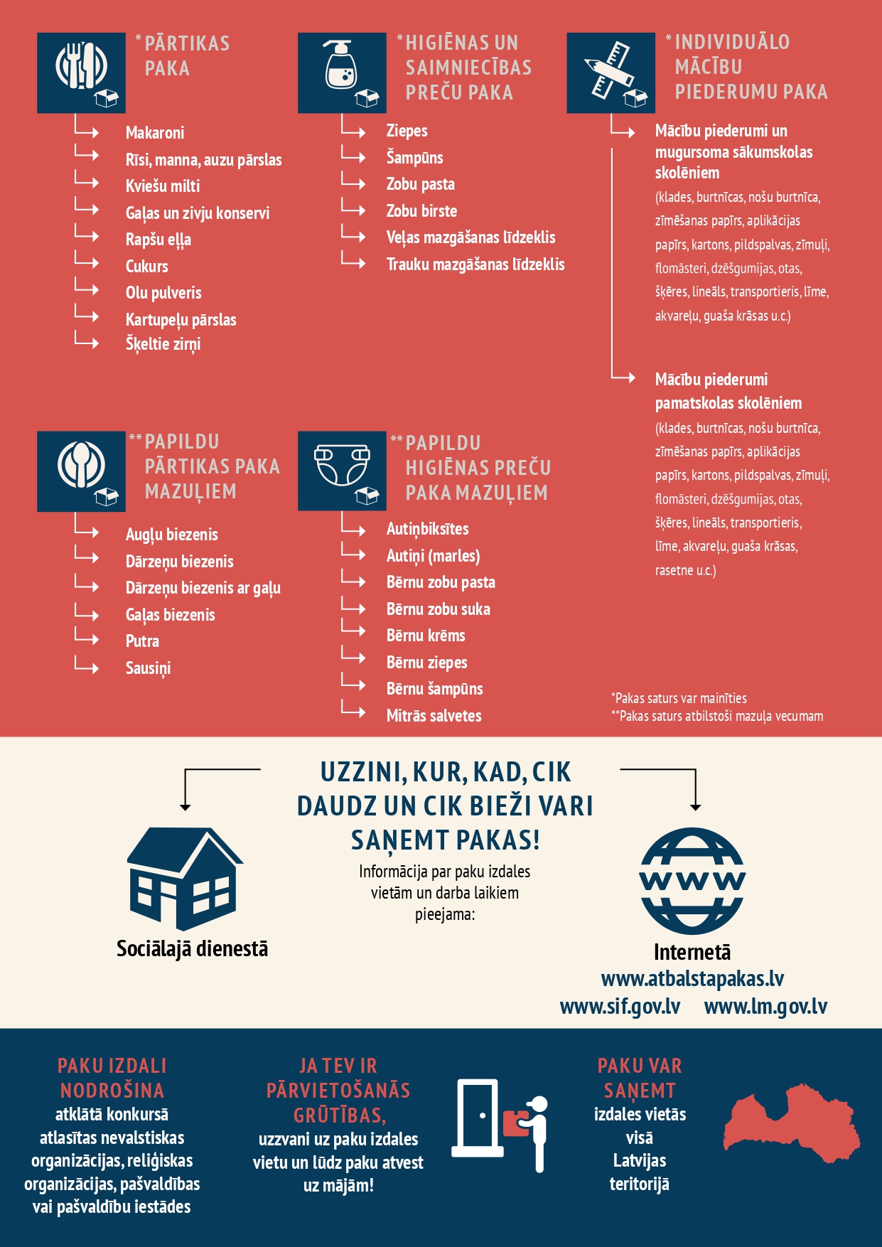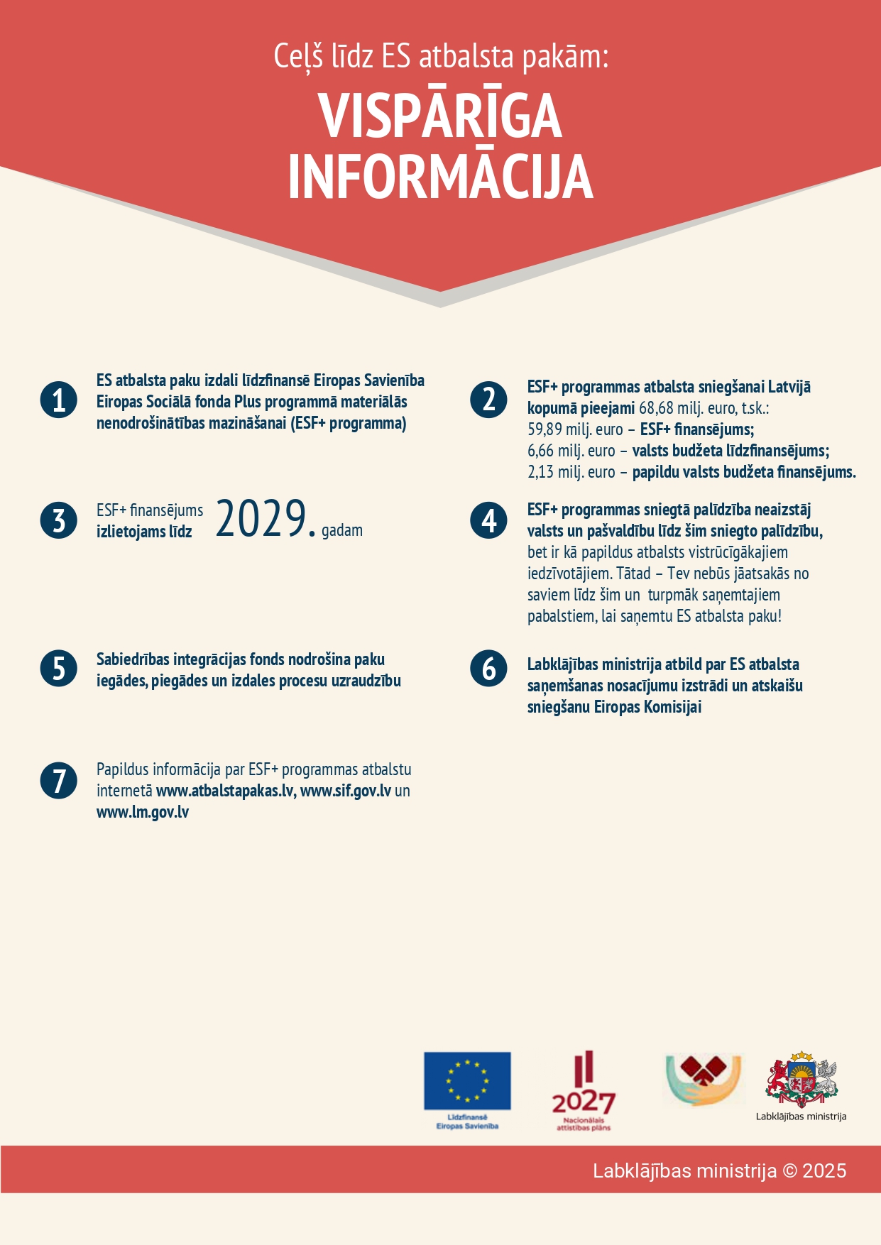 Labklājības ministrija sagatavojusi aktualizētu informatīvu materiālu par Eiropas Sociālā fonda Plus programmas materiālās nenodrošinātības mazināšanai 2021.-2027. gadam atbalstu “Ceļš līdz ES atbalsta pakām: kas un kā?”.