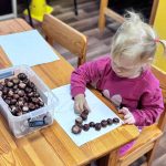 Oktobrī vērojām pārmaiņas dabā. Priecājāmies par siltajām, saulainajām rudens dienām, izzinājām lietu un visu, kas ar to saistīts. Devāmies lasīt koku krāsainās lapas, vērojām, kā krīt zīles un kastaņi. Salasījām tās, jo noteikti noderēs sīkās pirkstu motorikas trenēšanai un attīstībai. Neizpalika arī čiekuru pētīšana un lasīšana. Devāmies uz tuvāko mežu, lai iepazītu kokus un uzzinātu to nosaukumus. Pastaigu laikā aktīvi vērojām arī gājputnus – redzējām, kādās rindās un kāšos tie dodas prom uz siltajām zemēm.