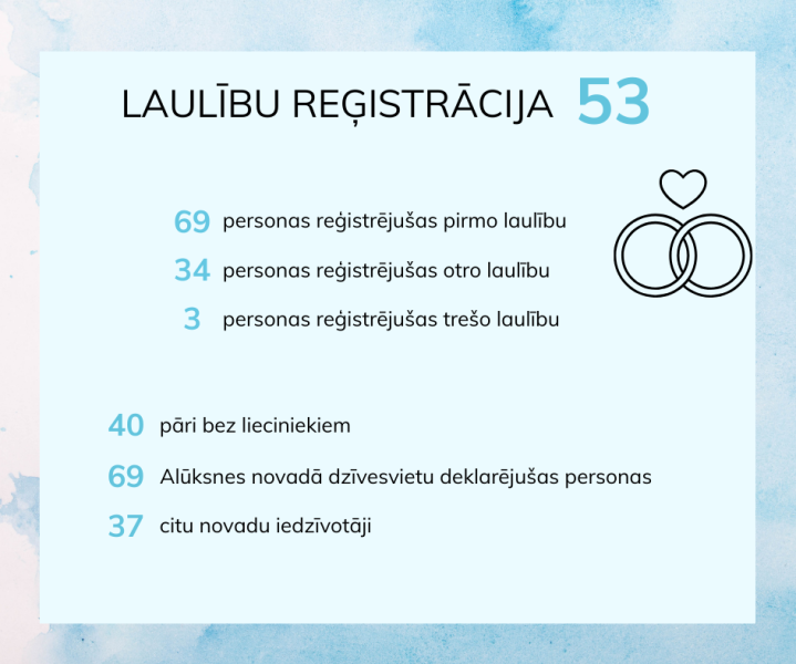 Pagājušajā gadā reģistrētas 53 laulības. Laulību reģistrējušas 69 Alūksnes novadā dzīvesvietu deklarējušas personas un 37 citu novadu iedzīvotāji. Bez lieciniekiem laulību reģistrējuši 40 pāri.