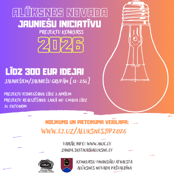 Līdz 3. aprīlim Alūksnes novada jaunieši vecumā no 13 līdz 25 gadiem aicināti piedalīties Alūksnes novada pašvaldības izsludinātajā jauniešu iniciatīvu projektu konkursā. Piedaloties projektu konkursā, jauniešiem ir iespēja realizēt savas idejas, saņemot finansējumu vienam projektam līdz 300 eiro apmērā. Visa informācija par konkursu: ej.uz/aluksnesjip2026