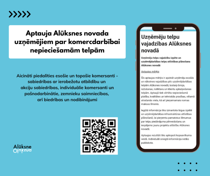 Alūksnes novada pašvaldība aicina esošos un topošos uzņēmējus piedalīties aptaujā, kuras mērķis ir apzināt uzņēmumu vajadzības pēc dažāda veida – biroja, ražošanas, noliktavu un klientu apkalpošanas – telpām novadā komercdarbībai.