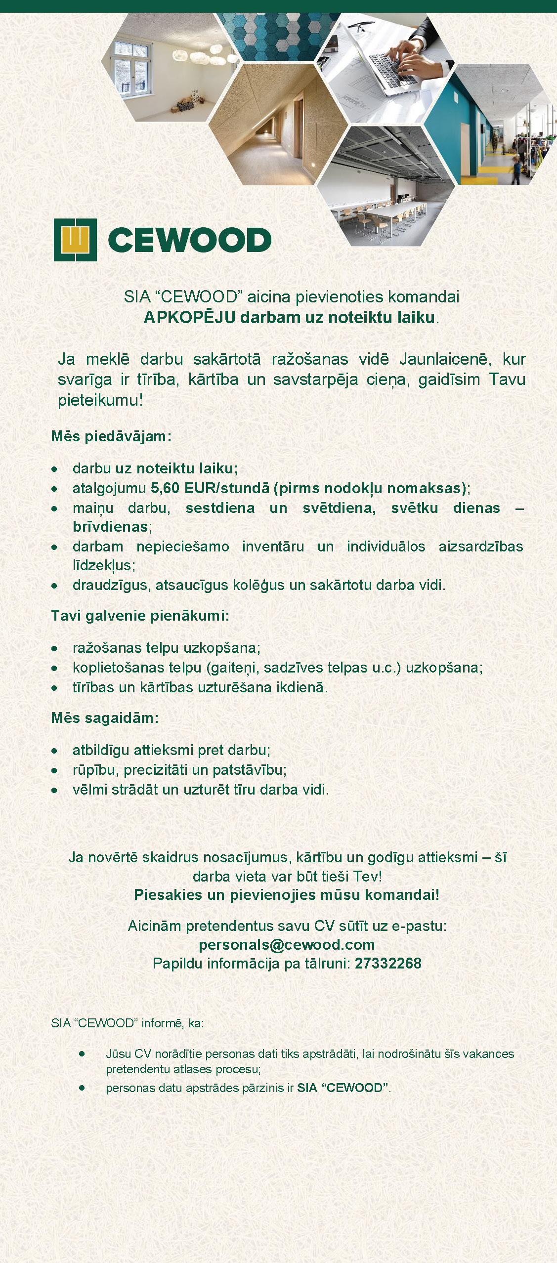 Vakanču publicēšanai uzņēmēji aicināti sagatavot sekojošu informāciju - uzņēmuma nosaukums, vakantā amata nosaukums, slodze, prasības pretendentam, CV un motivācijas vēstules nepieciešamība, iesniegumu pieņemšanas termiņš, uzņēmuma kontakti (tālrunis, e-pasts).Informācija publicēšanai jānosūta uz e-pastu: evita.aploka@aluksne.lvTiks publicētas tikai Alūksnes novada uzņēmumu vakances, ja sludinājumā būs norādīts vakances pieteikšanās beigu termiņš. |